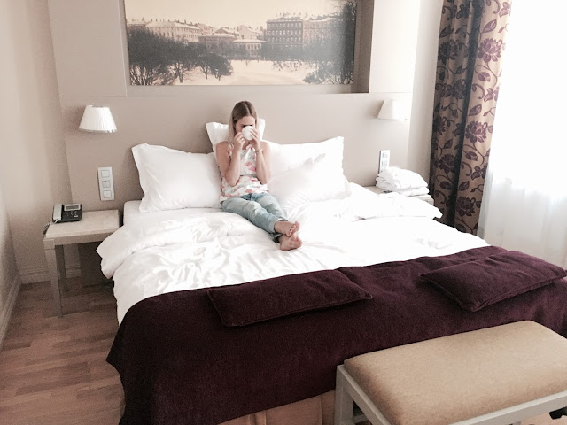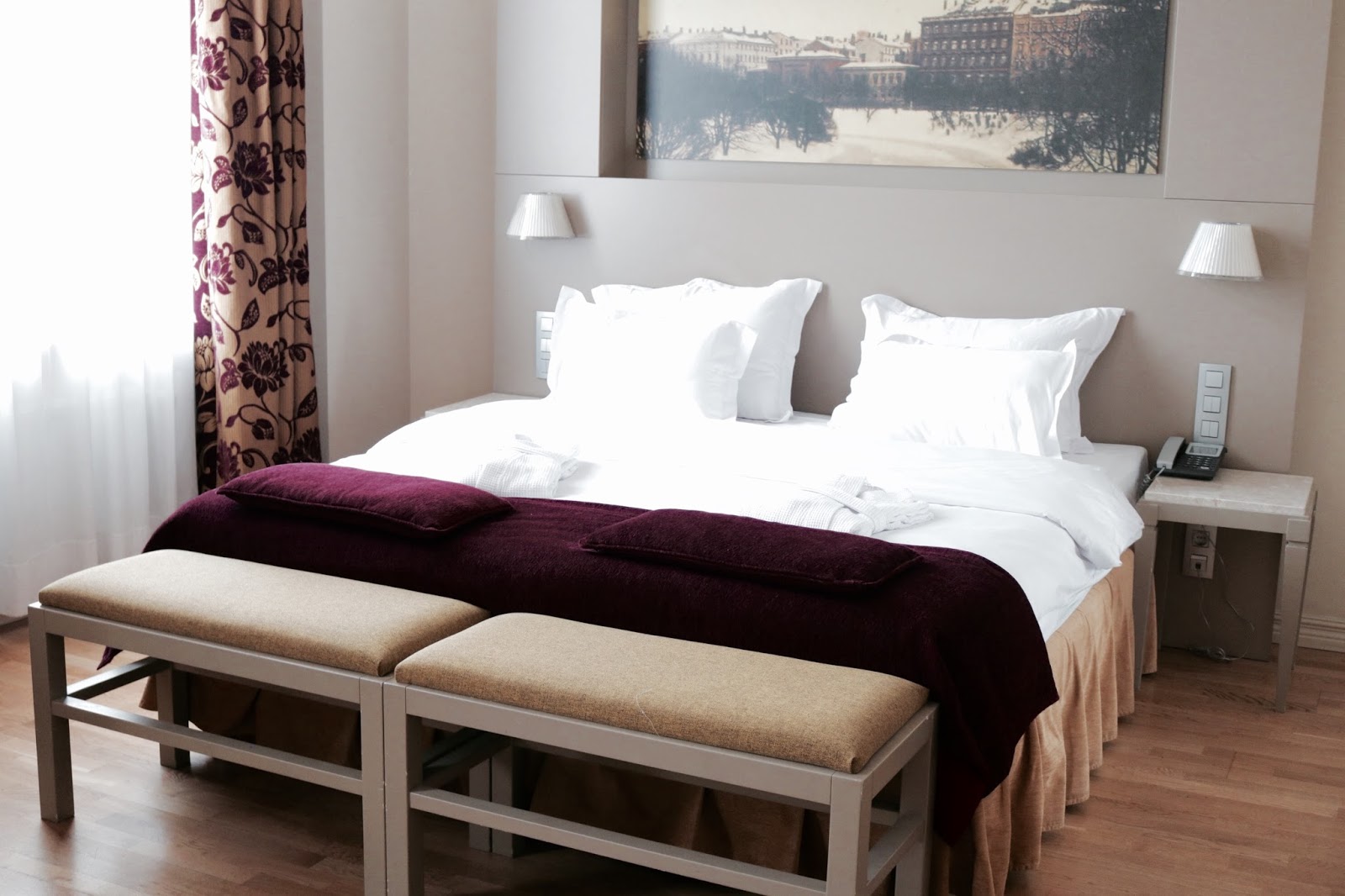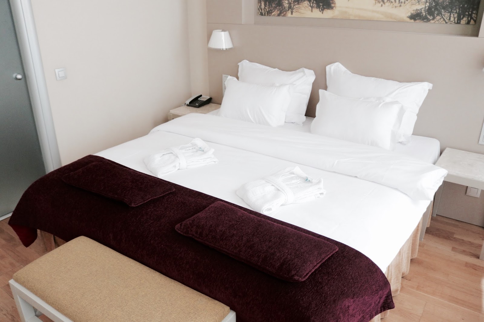 Viešbučio privalumas- vieta. Turbūt, tai ir bus didžiausias pliusas. Likome patenkinti ir kambariais, jie labai erdvūs ir tvarkingi. Tačiau apsistojome ne standartiname numeryje, bet gavome geresnįjį dvivietį kambarį. Tad mūsų čia laukė vonia, su keliomis masažinėmis srovėmis. Tiesa mažytė, tad taip ir nepasinaudojome. Taip pat kambaryje buvo mini baras, nors ir mokamas, tačiau pasirinkimas platus. Didžiulis plokščiaekranis televizorius- šiuo privalumu taip pat nepasinaudojome, kadangi beveik visą laiką keliavome pažinti miestą, tad viešbutyje tik permiegodavome. Kambaryje rasite ir virdulį bei kavos, arbatos. Mūsų mažylių personalas pasirūpino taip pat kambaryje pastatydami maniežą. Tad ir Gustas turėjo savo zoną, kurioje ne tik miegodavo, bet ir žaisdavo. O ir mūsų lovos labai didelės ir tikrai patogios. Man tai būna ko ne svarbiausia viešbutyje. Ir išsimiegojau puikiai. Turėjome abu po dviejų dydžių pagalvę, galėjome išsirinkti patogiausią sau.
